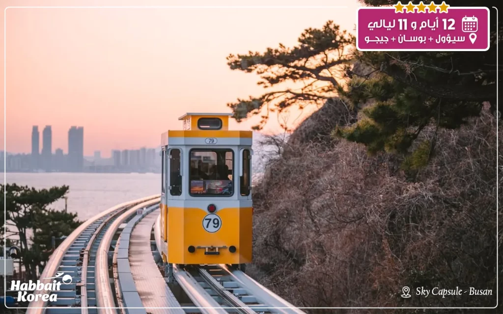 الانطلاق بالقطار السريع إلى بوسان. جولة في قرية غامشون الثقافية وتجربة التلفريك البحري. زيارة معبد هايدونغ يونغغونغسا المطل على البحر وتجربة كبسولات القطار البحري "سكاي كابسول".